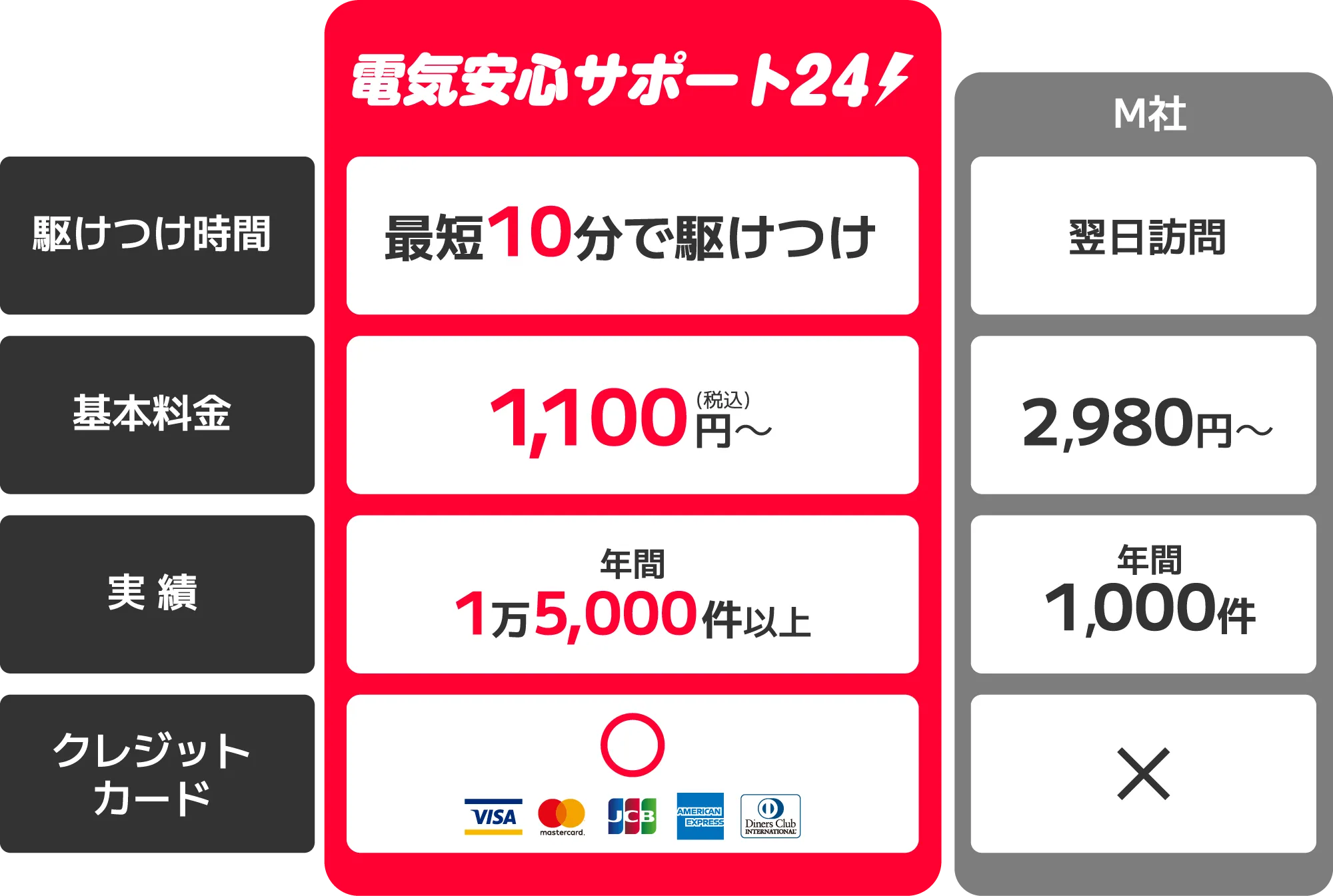 数多くの現場を経験した熟練の専門スタッフが常に待機しております。最短10分で駆けつけ、電気のトラブルを解決します。24時間365日対応いたします!